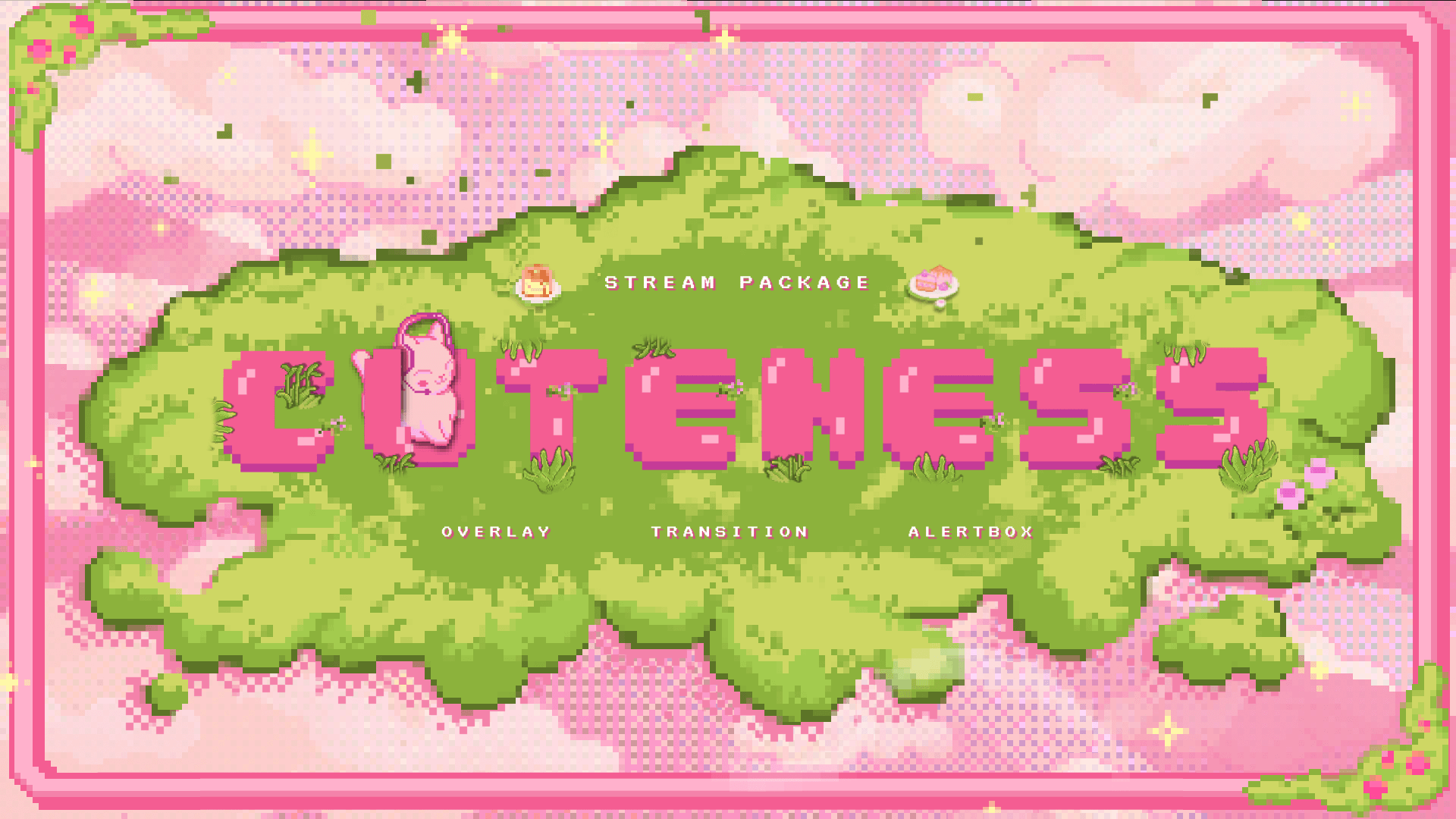 Kawaii! Cuteness — a new charming stream package. Just look at these pixel-art kittens, clouds and cakes — how can someone resist this level of loveliness? Here we've included every important asset that you may ever need — Stream Screens, Overlays, Stinger Transition, Alerts and many more. Also it supports Twitch, YouTube, Facebook Gaming and works with your favorite streaming software. Nya!
