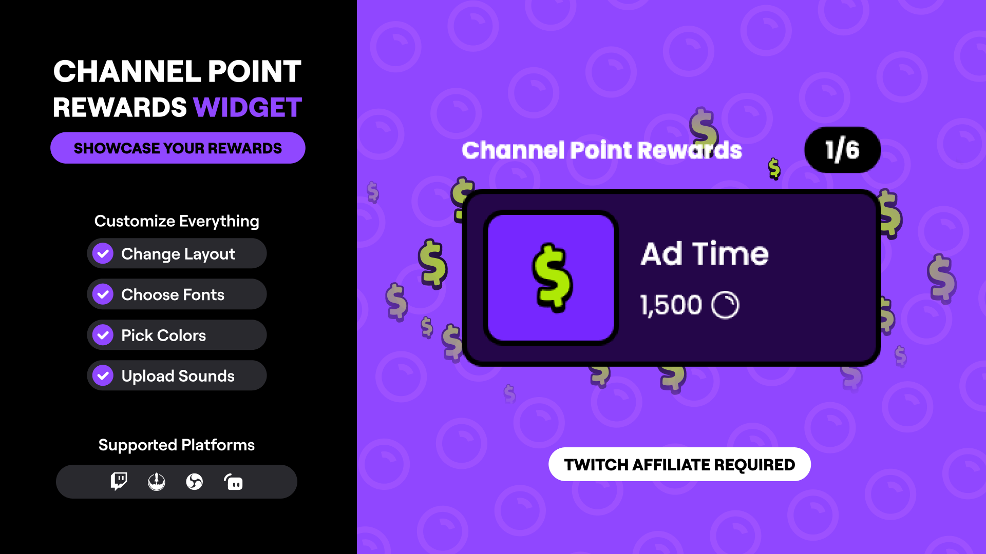 Show off your Channel Point rewards in style with this modern Twitch widget. It auto-rotates your active rewards on screen so viewers always know what’s available, with optional pop-up alerts for redemptions. Customize fonts, colors, and layout to fit your stream’s design. Great for increasing viewer interaction and boosting redemptions. Twitch Affiliate or Partner required.