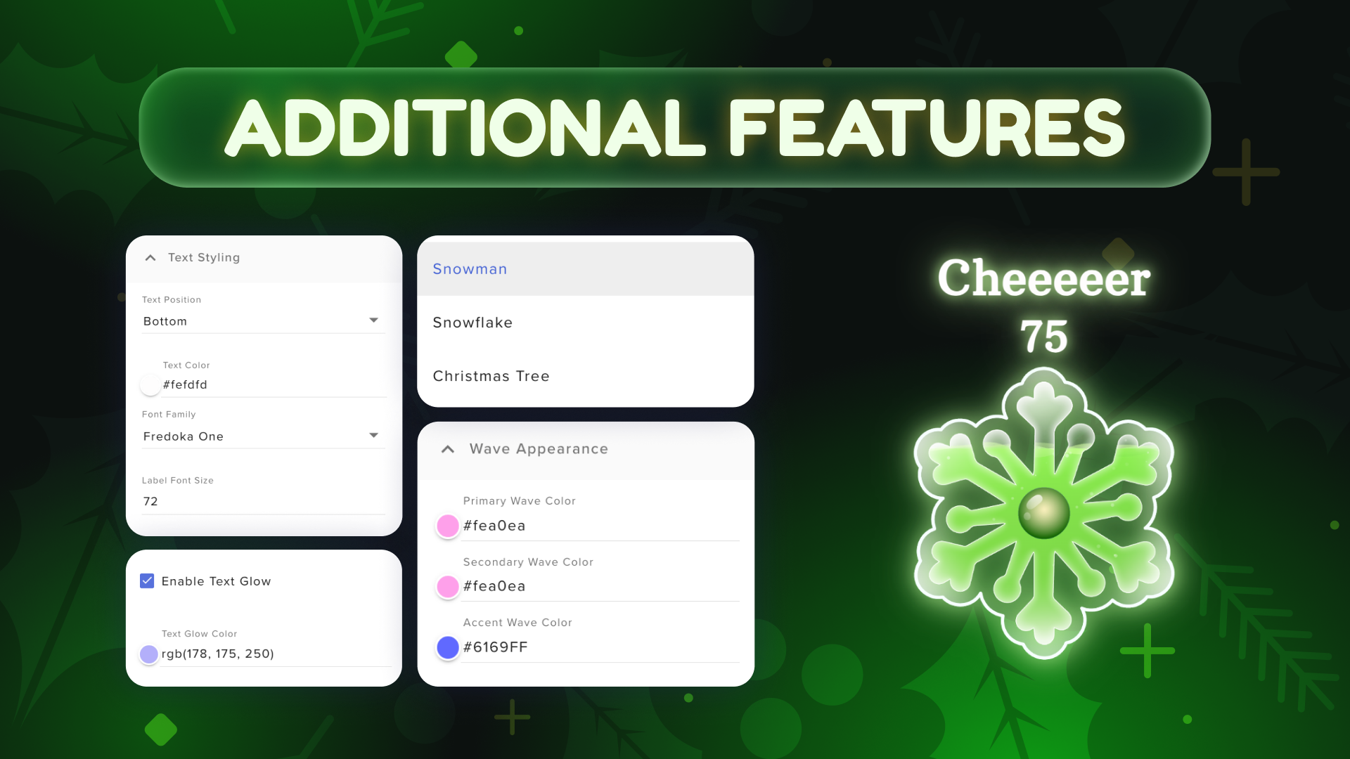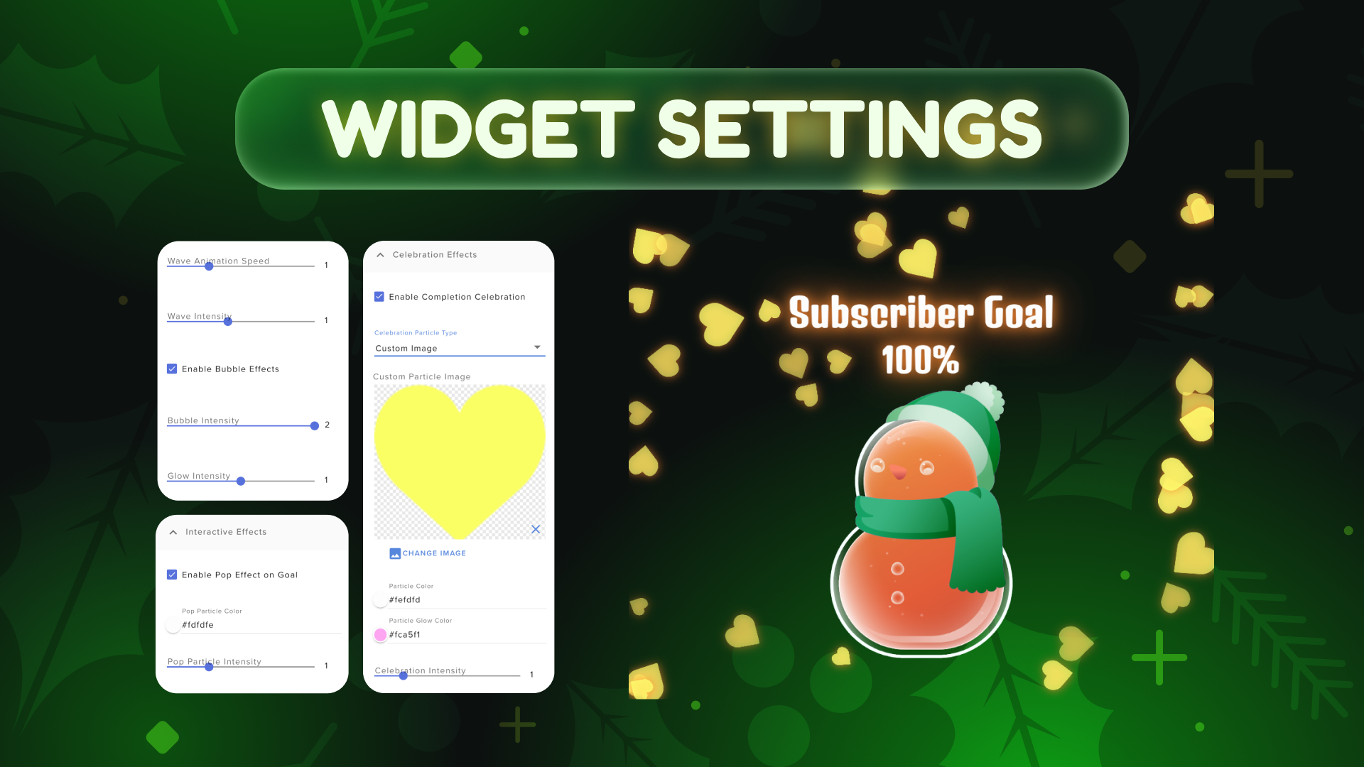 A festive stream overlay that tracks your goals in Christmas style. Choose between a Snowman, Snowflake, or Christmas Tree design, and fully customize your colors, glow, and sparkle effects. Works with Twitch and YouTube to track followers, subs, tips, cheers, and more.