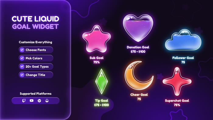 Level up your stream goals with the Cute Liquid Goal Widgets — an animated collection of 6 adorable designs: Moon, Star, Star 2, Heart, Cloud, and Crystal. Watch colorful liquid fill your goal shape as your followers, subs, or tips grow, complete with glowing waves, bubbles, and celebration effects. Fully customizable with colors, fonts, and animations, these overlays bring cozy, kawaii vibes to any stream. Works perfectly with Twitch, YouTube, StreamElements, and OBS Studio.