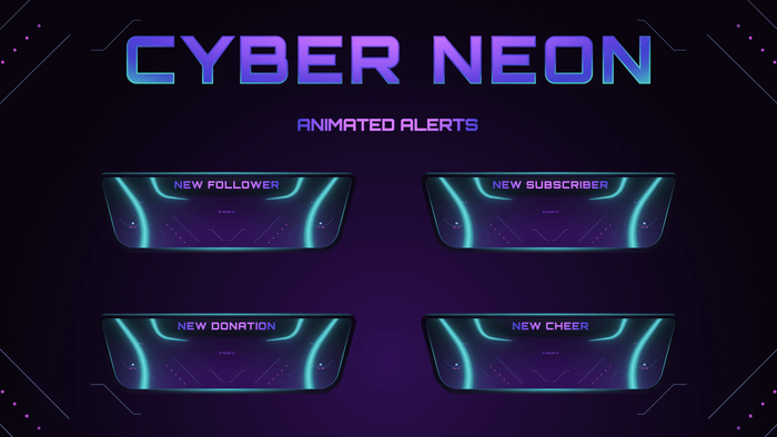 Launching in 3.. 2.. 1… Cyber Neon — futuristic stream alerts with extraterrestrial vibe. Designs inspired by spaceships combined with glitches make these alerts a unique tool in your streaming arsenal. These Alerts are part of the Cyber Neon Stream Package. Works with Twitch, YouTube, Facebook Gaming and supports OBS Studio, Streamlabs and StreamElements.