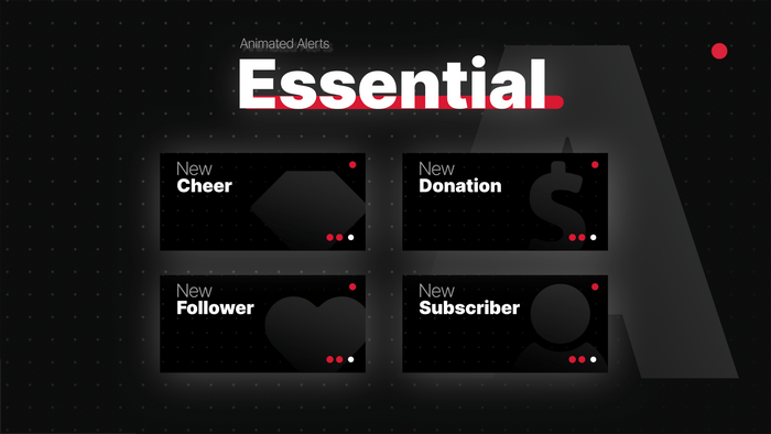 Less is more! Essential — black minimalist stream alerts. Inspired by Swedish design these alerts will suit any stream. These Alerts are part of Essential Stream Package. Works with Twitch, YouTube, Facebook Gaming and supports OBS Studio, Streamlabs and StreamElements.