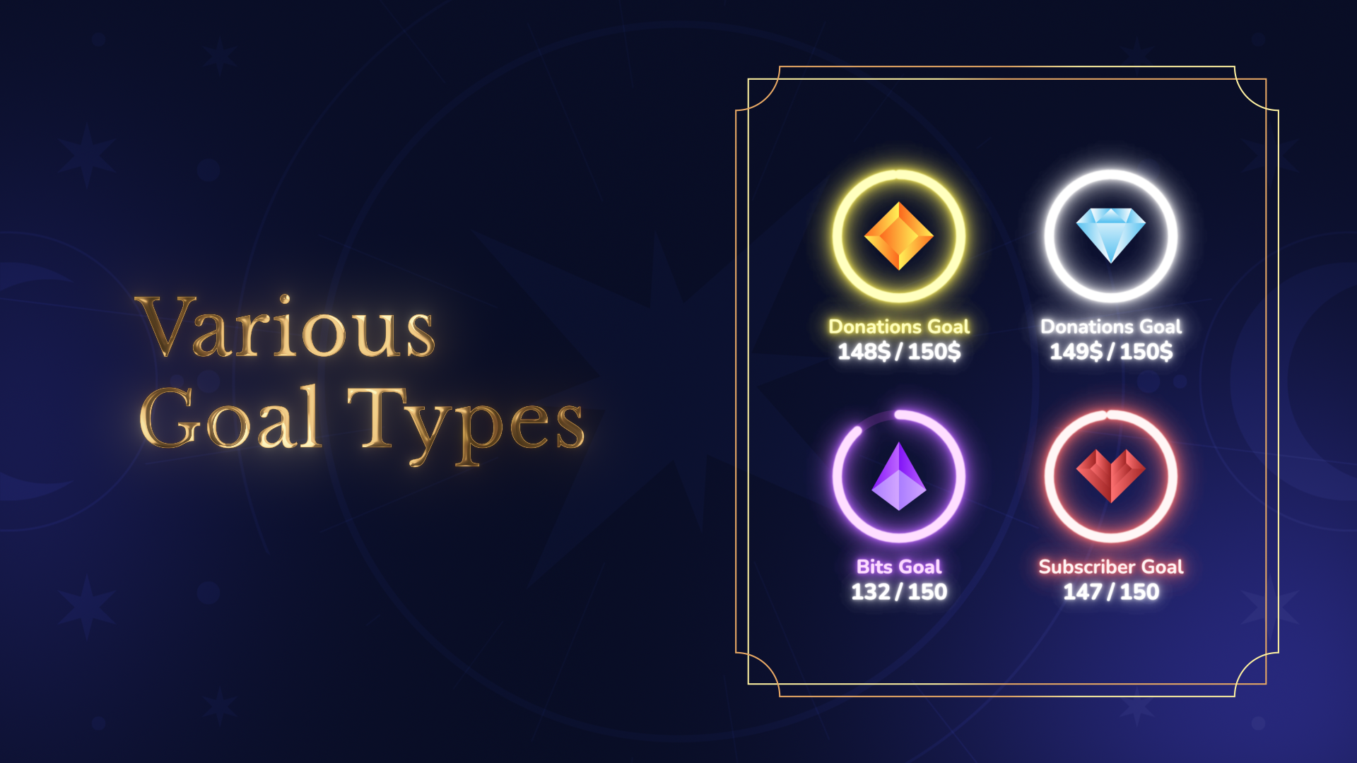 Bring a touch of magic to your stream with the Fantasy Goal Widget. This elegant circle-shaped widget, featuring a majestic glow effect, lets you set and display goals for follows, subs, cheers, and tips. Customize icons, fonts, and colors to match your style. Perfect for Twitch and YouTube, designed for StreamElements, and compatible with any streaming software.