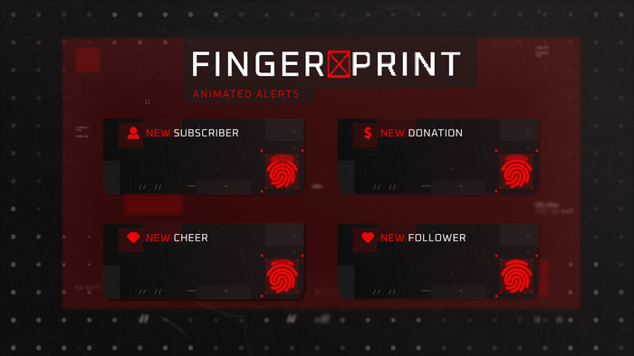 Leave your mark with Fingerprint — stream alerts that grab attention with a unique sleek glitch design. Make every alert a signature moment. Part of the Fingerprint Stream Package. Compatible with Twitch, YouTube, Facebook, and more.