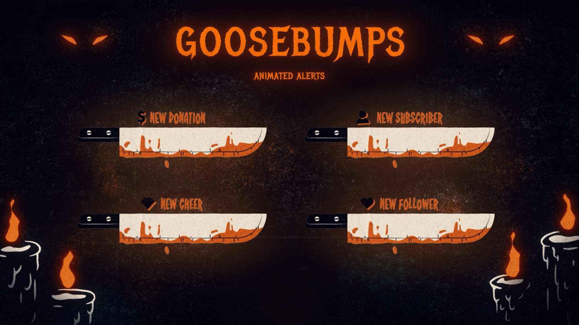 Ignite the eerie aura! Goosebumps - a stream overlay package emanating haunting Halloween vibes. Dive into a realm where ghoulish eyes watch over. All assets included — Stream Screens, Overlays, Stinger Transition, Alerts, and many more. Works with Twitch, YouTube, Facebook and supports OBS Studio and Streamlabs.