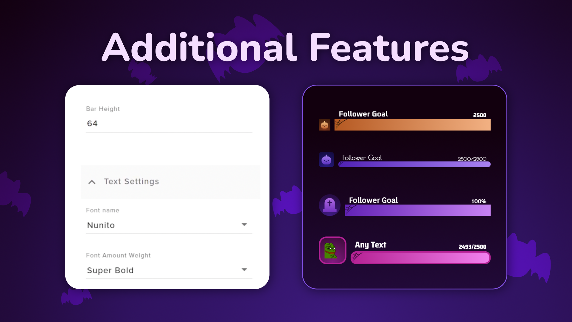 Get into the spooky season with the Halloween Goal Widget! Set goals for follows, subs, cheers, or tips with a fun, Halloween-themed look. Customize the icons, fonts, and colors to fit your style. Designed for Twitch and YouTube, optimized for StreamElements, and works with OBS Studio and other streaming software.