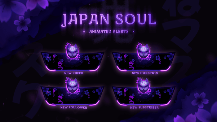 Get Magical with Japan Soul — atmospheric stream alerts with a mythological Japanese aesthetic. Its distinctive color palette and design elements fit any modern stream. These Alerts are part of the Japan Soul Stream Package. Works with Twitch, YouTube, Facebook Gaming and supports OBS Studio, Streamlabs and StreamElements.