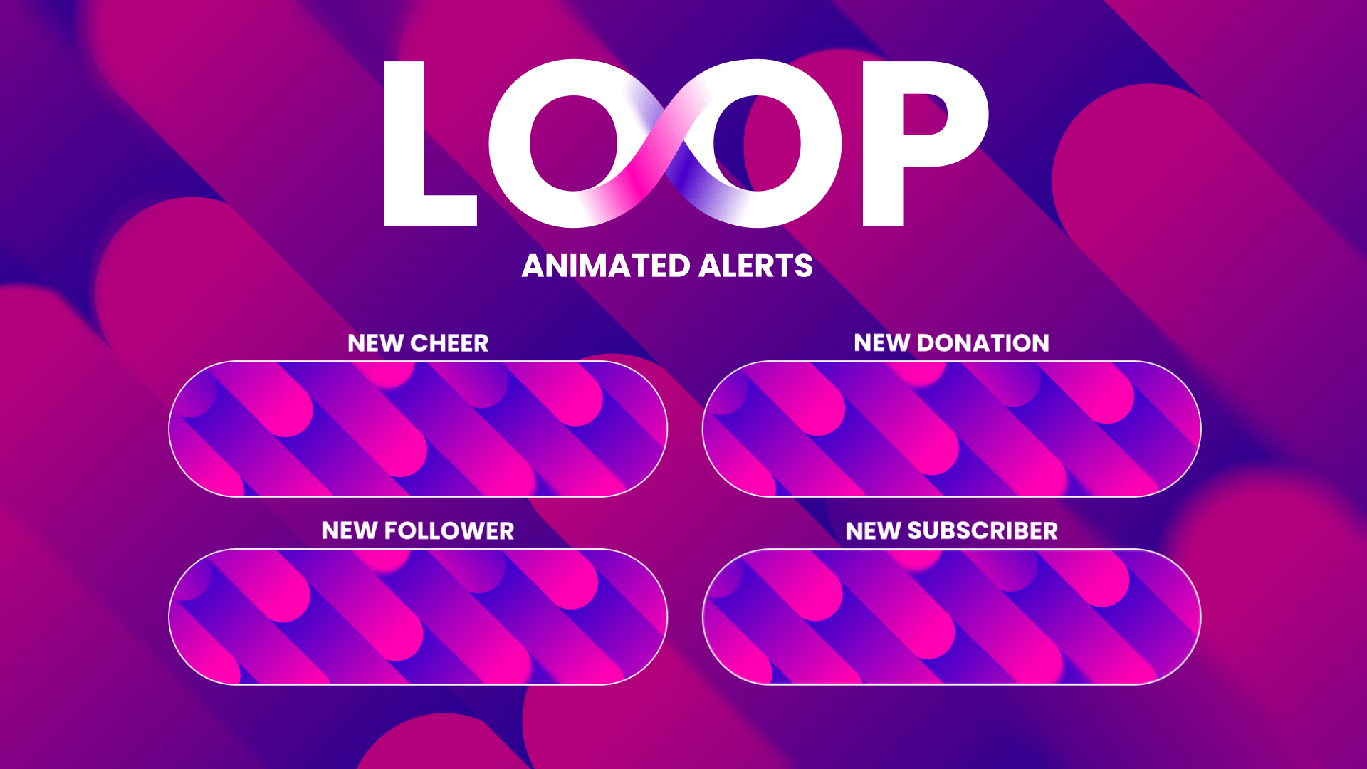 Let The Fun Begin! Loop — bright stream alerts with simple 2D design. This pack will add positive energy to any kind of stream. These Alerts are part of Loop Stream Package. Works with Twitch, YouTube, Facebook Gaming and supports OBS Studio, Streamlabs and StreamElements.