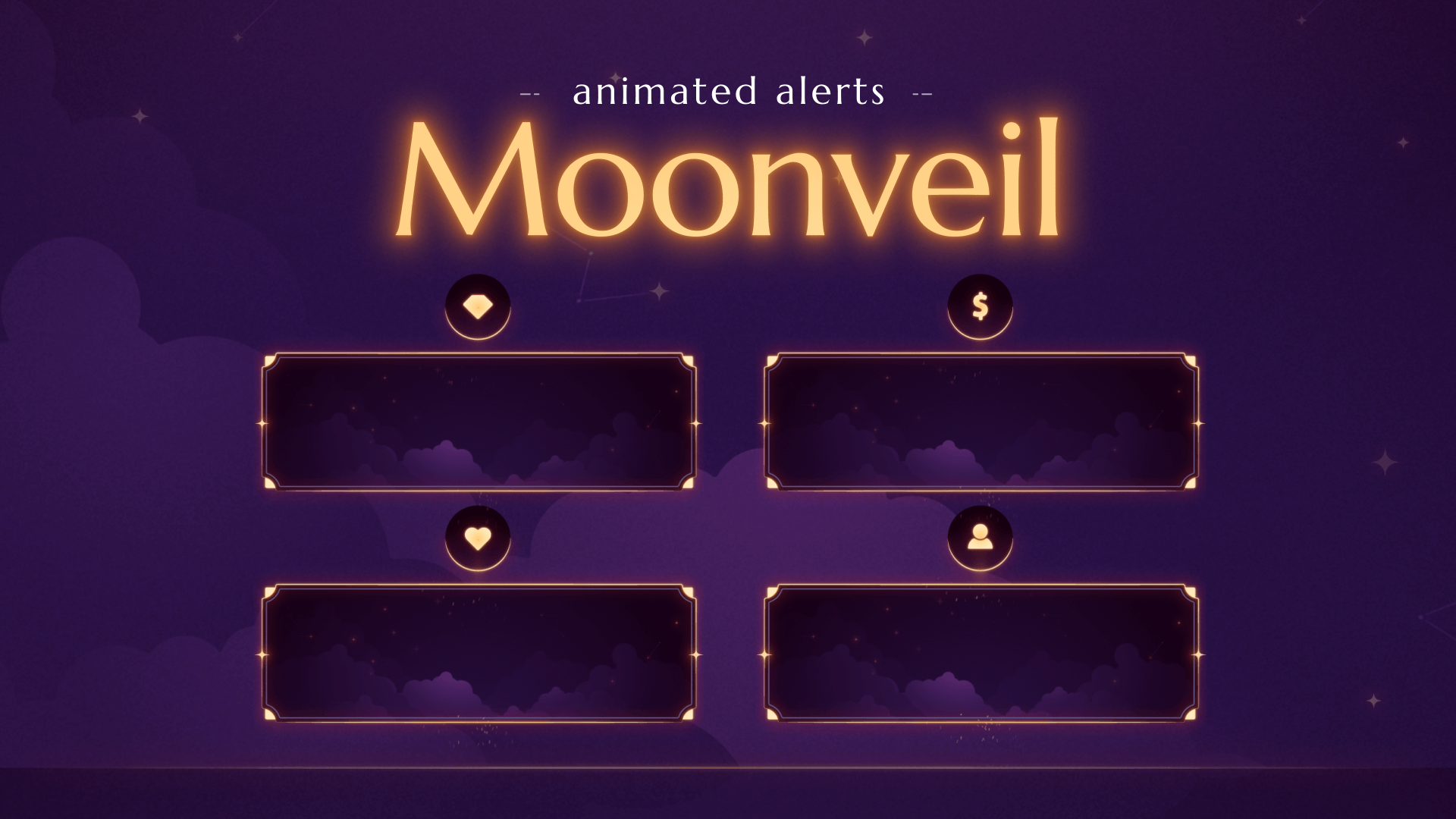 Light up your alerts with Moonveil — whimsical celestial stream alerts featuring glowing moons, shimmering stars, and flowing cloud animations. These charming designs bring a touch of magic and softness to every notification. Part of the Moonveil Stream Package, compatible with Twitch, YouTube, Facebook, OBS Studio, Streamlabs, and StreamElements.