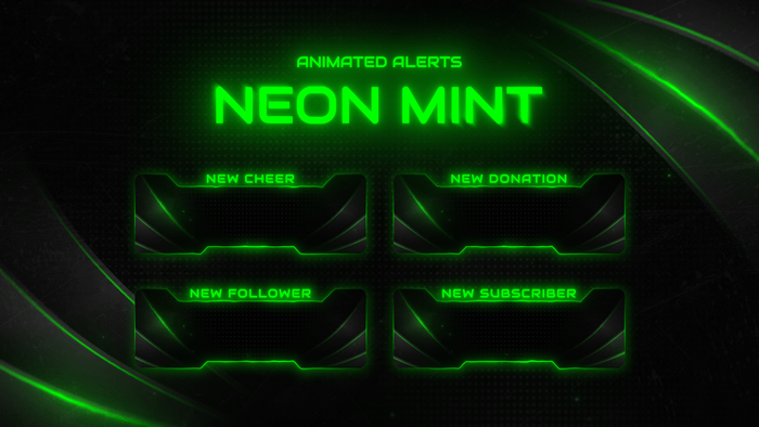 Energize with Neon Mint — gaming stream alerts with minimalistic glowing design. Dynamic shapes combined with a vibrant color palette make this pack perfect for every stream. These Alerts are part of the Neon Mint Stream Package. Works with Twitch, YouTube, Facebook Gaming and supports OBS Studio, Streamlabs and StreamElements.