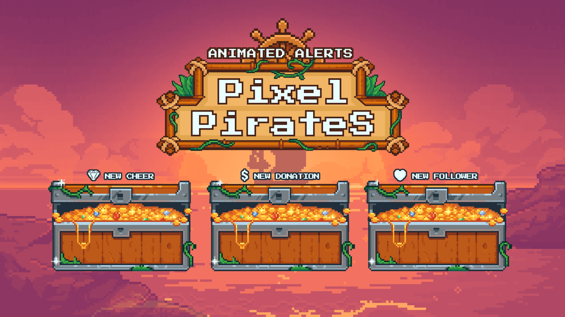 Set sail with Pixel Pirates — vibrant stream alerts crafted with pixel art aesthetics. Infuse your stream with the excitement of a pirate's adventure! These alerts are part of the Pixel Pirates Stream Package. Works with Twitch, YouTube, Facebook and supports OBS Studio, Streamlabs, and StreamElements.