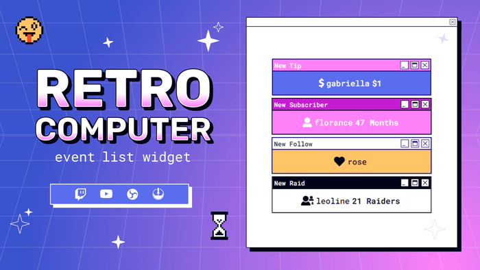 Showcase your stream milestones in a nostalgic retro style with the Retro Computer Event List. Whether it's new followers, cheers, donations, subscribers, gifts, or raids, each event is displayed with a touch of vintage flair. Bespoke customization included — from the number of events displayed on screen, unique colors for each event, to font customization, and much more. Ideal for Twitch and YouTube, optimized for StreamElements, and compatible with various streaming software.