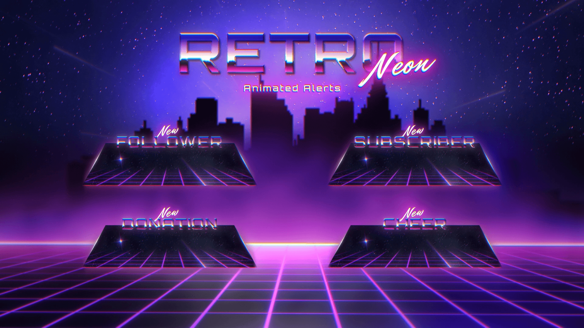 Back to The Future! Retro Neon — essential retro-futuristic stream alerts that add some proper nostalgic atmosphere to your stream. These alerts are part of Retro Neon Stream Package — perfect choice if you’re fond of 80’s aesthetics and want to achieve that classic VHS retro look. Works with Twitch, YouTube, Facebook Gaming and includes Quick Installs for Streamlabs and StreamElements.