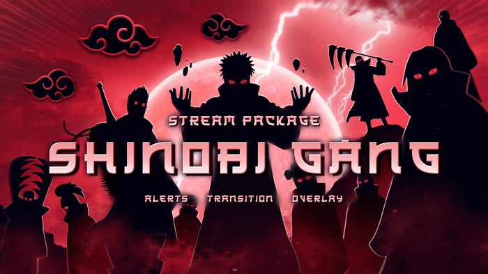 Unleash your inner ninja with Shinobi Gang — a striking stream overlay package inspired by the infamous Akatsuki from the Naruto anime series. Let the powerful presence of the shinobi clan, framed by a backdrop of a full moon and electrifying clouds, set the stage for your streaming adventures. All assets included — Stream Screens, Overlays, Stinger Transition, Alerts, and many more. Works with Twitch, YouTube, Facebook and supports OBS Studio and Streamlabs.