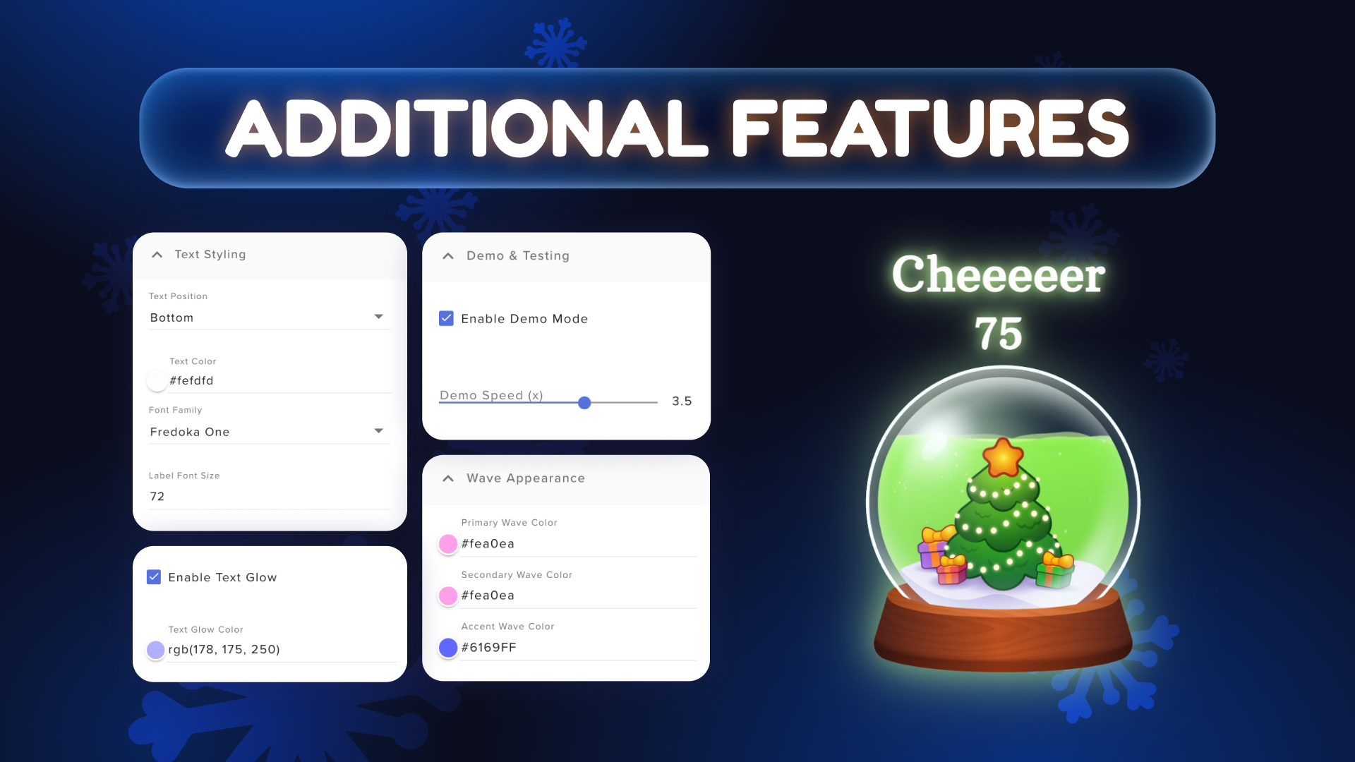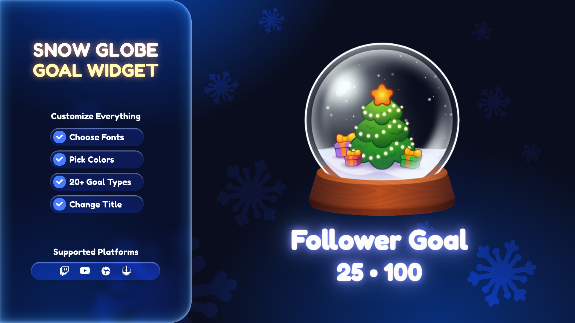 Bring your stream to life with a festive snow globe that fills as you reach your goals. Tracks followers, subs, bits, or donations on Twitch and YouTube. Features animated waves, snow effects, glow, and celebration particles — all fully customizable. Perfect for holiday or cozy stream themes.