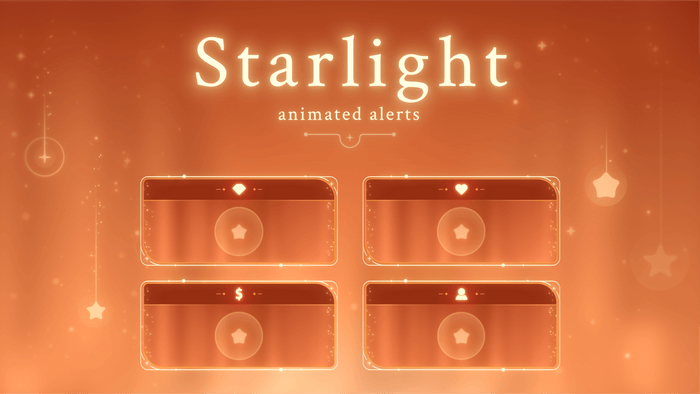 Shine bright with Starlight — celestial stream alerts with an ethereal aesthetic. With glowing stars and dreamy animations, these alerts will add a touch of magic to your stream. These alerts are part of the Starlight Stream Package. Works with Twitch, YouTube, Facebook, and supports OBS Studio, Streamlabs, and StreamElements.