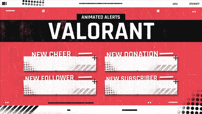 For The Brave! Valorant — dynamic stream alerts inspired by cybersports. Its grunge design mixed with futuristic layouts will work in any FPS game. These Alerts are part of the Valorant Stream Package. Works with Twitch, YouTube, Facebook Gaming and supports OBS Studio, Streamlabs and StreamElements.