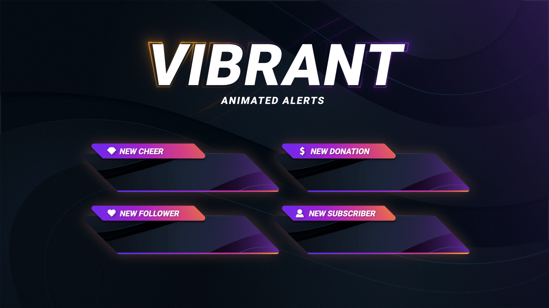 Be flexible with Vibrant — clean stream alerts with futuristic design. Saturated gradients with bold futuristic shapes make these alerts a great choice for your streaming needs. These Alerts are part of the *Vibrant Stream Package*. Works with Twitch, YouTube, Facebook and supports OBS Studio, Streamlabs and StreamElements.