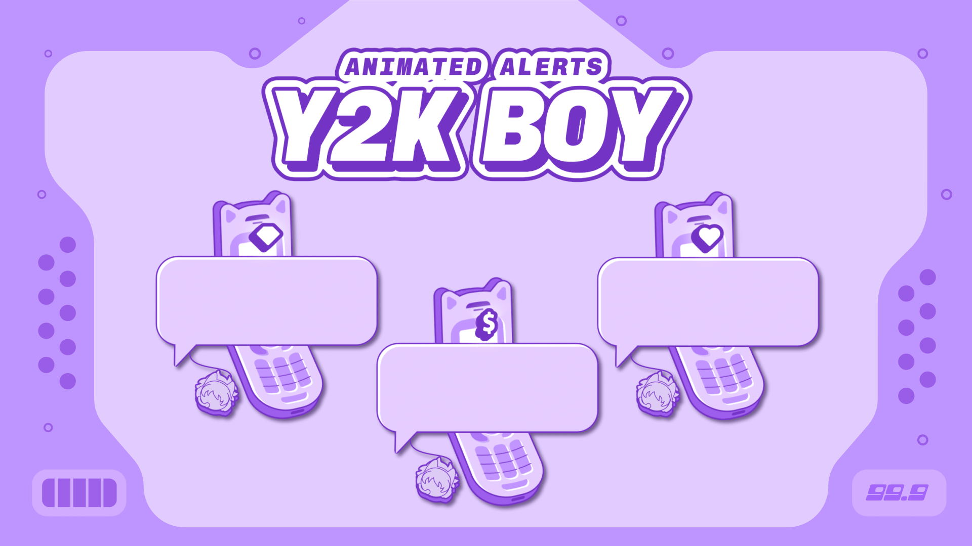 Get retro with Y2K Boy — stream alerts that capture the essence of early 2000s gaming culture. The vibrant colors and playful design make these alerts a perfect throwback addition to your stream. These alerts are part of the Y2K Boy Stream Package. Works with Twitch, YouTube, Facebook and supports OBS Studio, Streamlabs, and StreamElements.